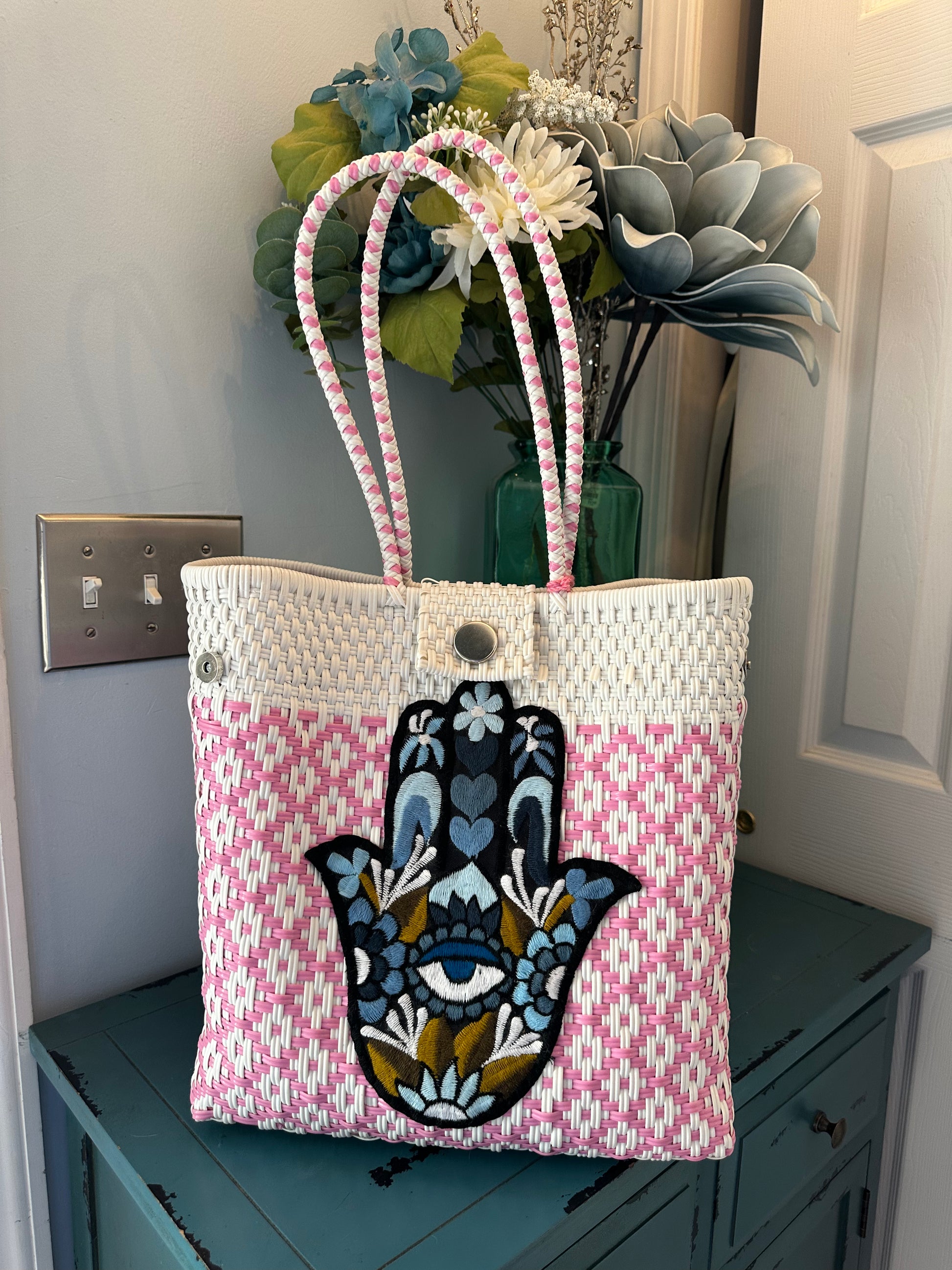Handwoven in Mexico from durable recycled plastic, this tote is thoughtfully crafted to combine everyday function with refined details. Designed for those who want practicality without sacrificing style, this piece offers a polished upgrade to the classic market bag.